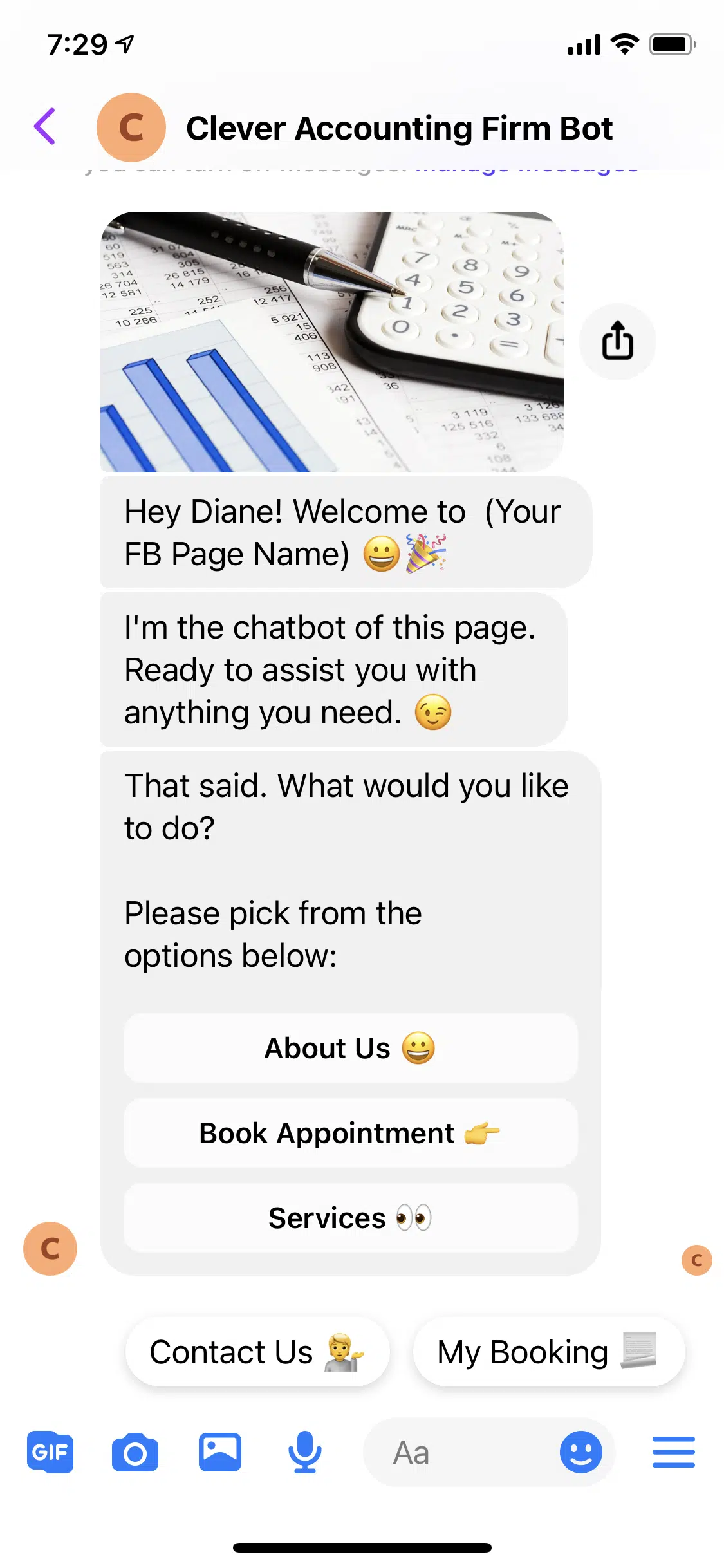Use this FREE Accounting Firm Template to install a chatbot on your Facebook Page.