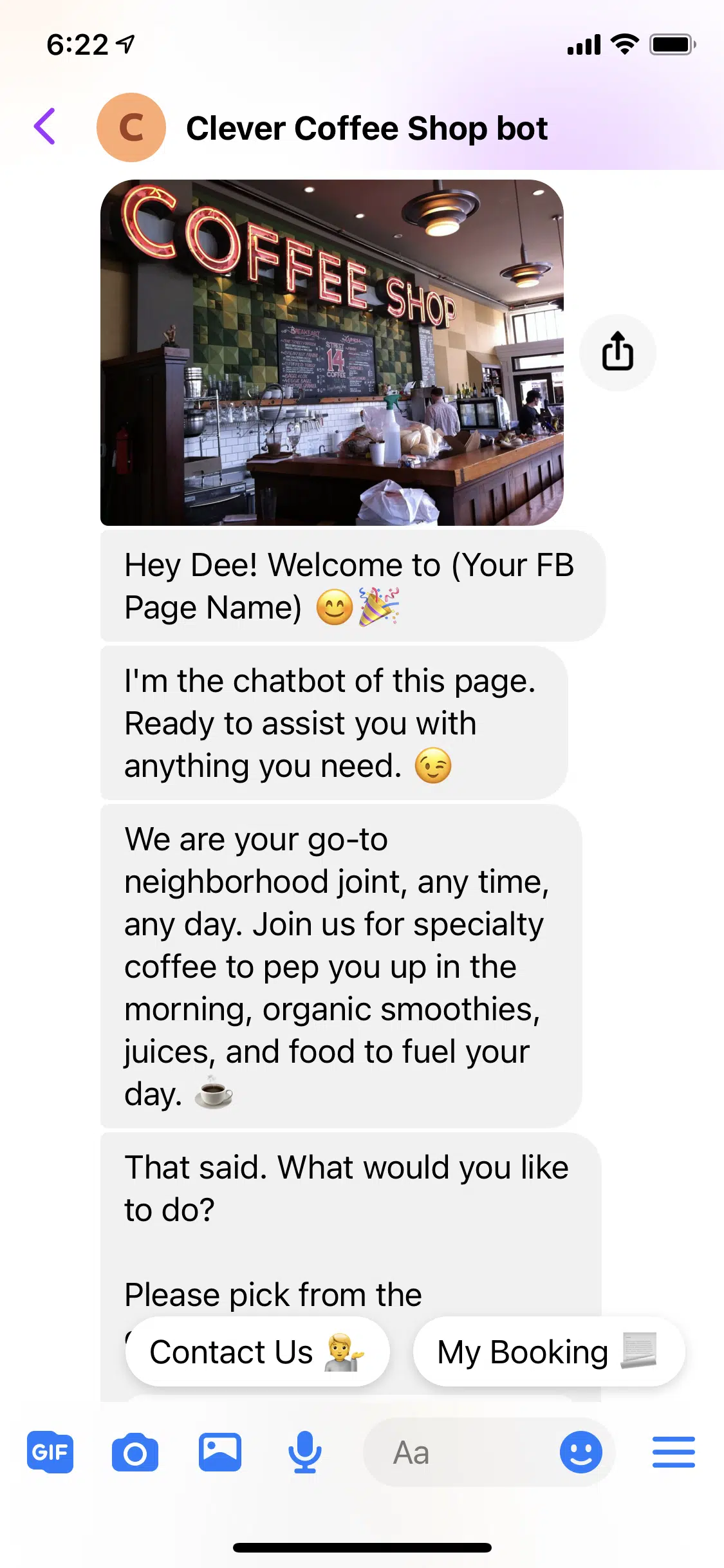 Use this FREE Coffee Shop Template to install a chatbot on your Facebook Page.