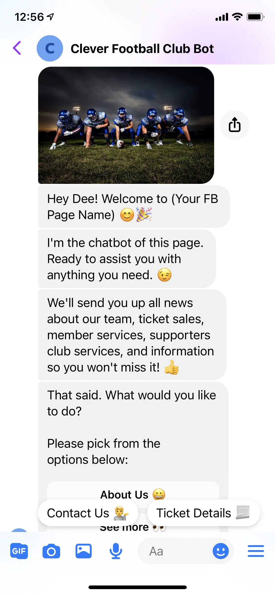 Use this FREE Football Club Template to install a chatbot on your Facebook Page.