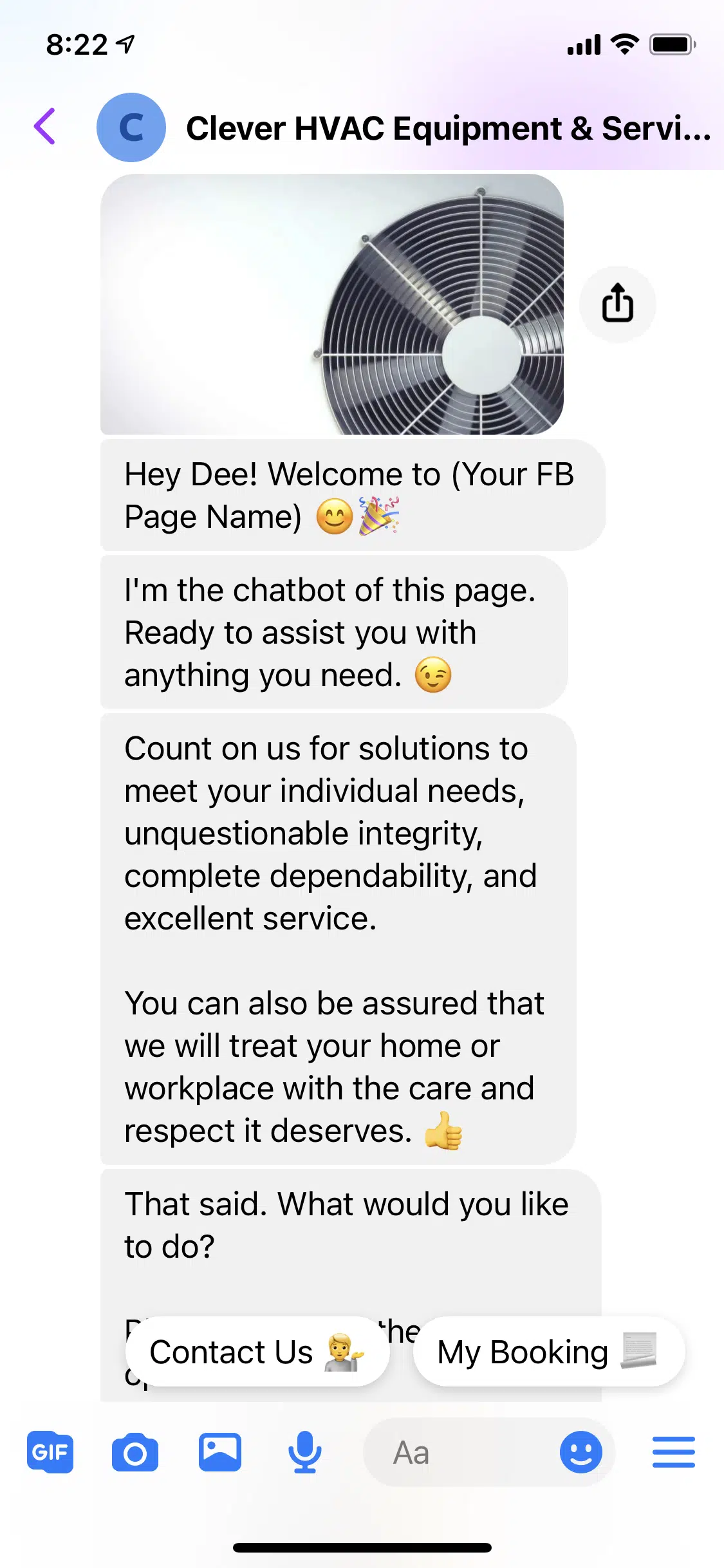 Use this FREE HVAC Equipment & Services Template to install a chatbot on your Facebook Page.