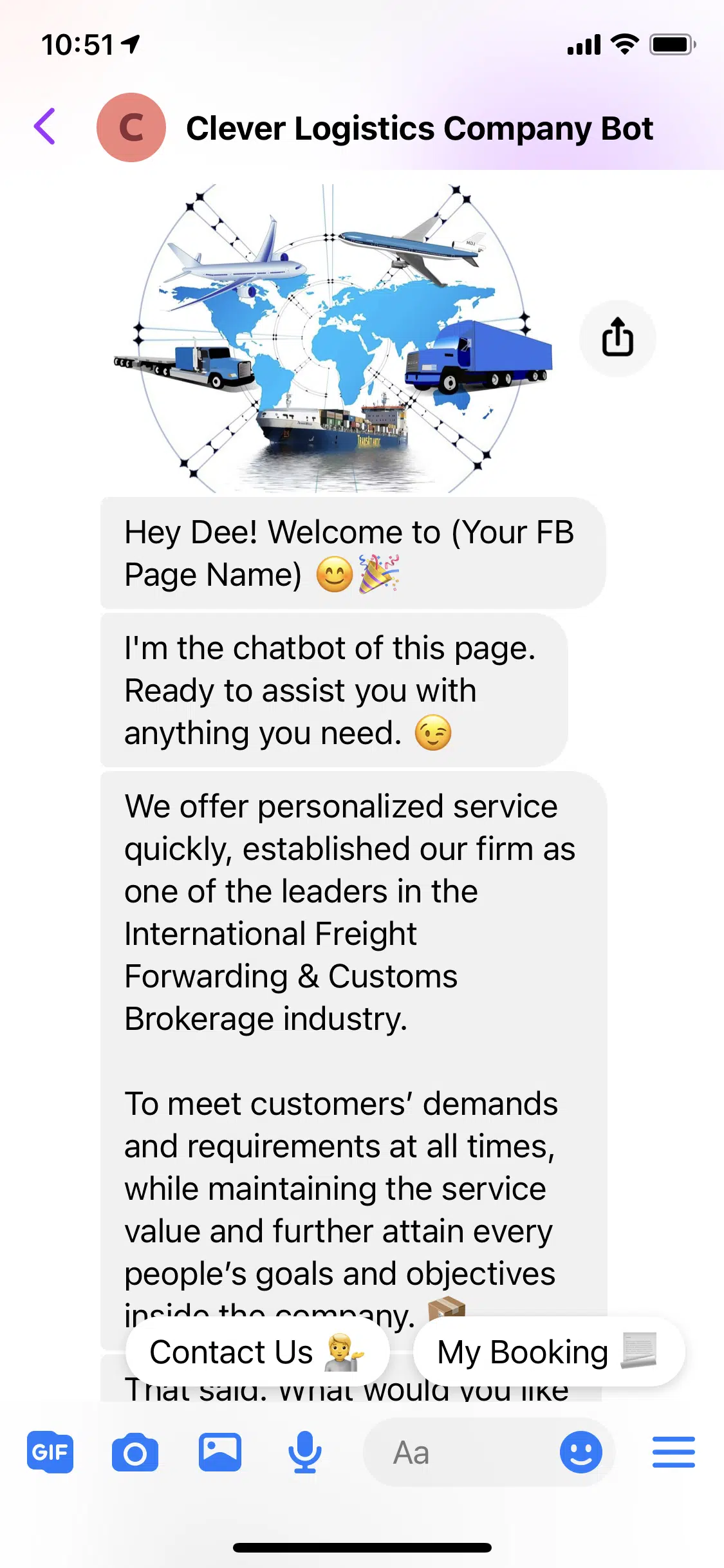 Use this FREE Logistics Company Template to install a chatbot on your Facebook Page.