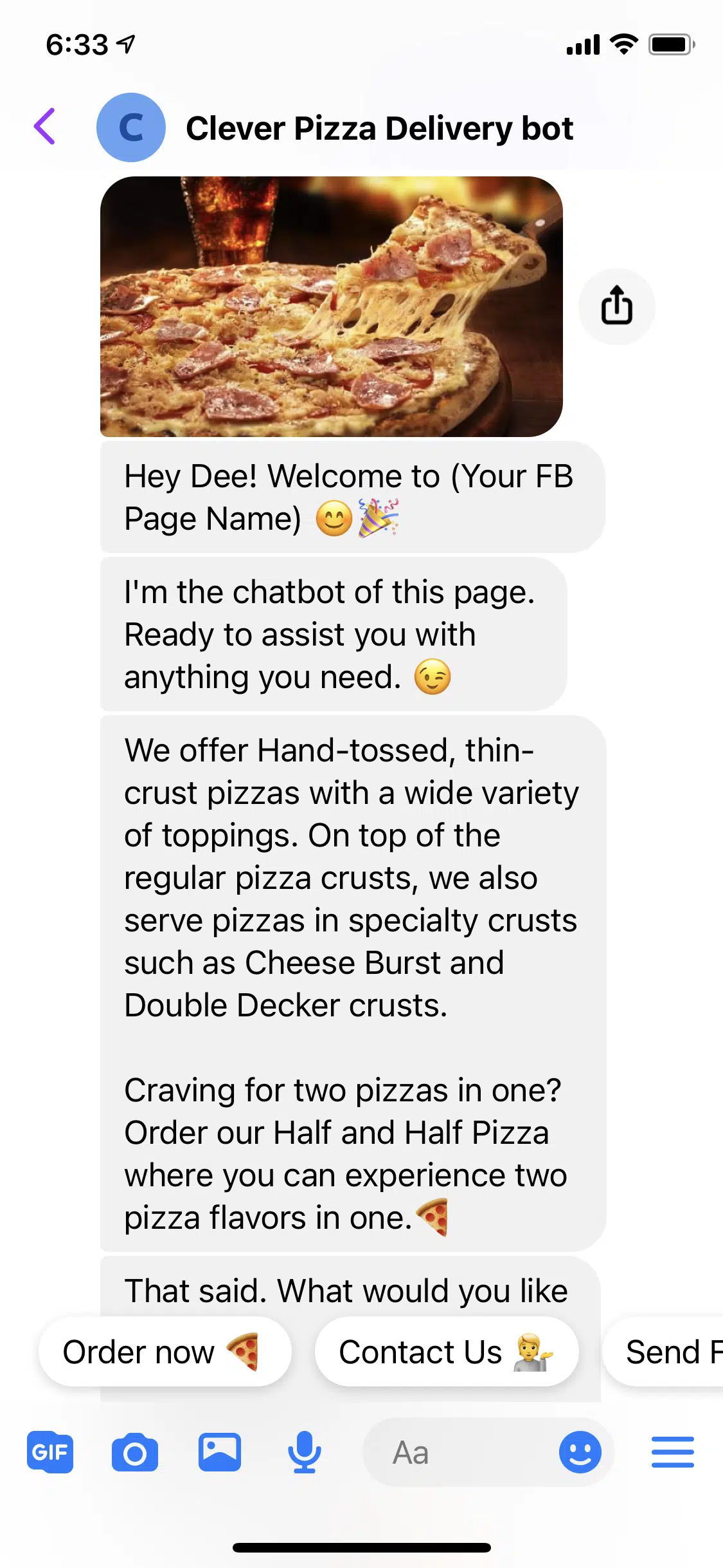 Use this FREE Pizza House Template to install a chatbot on your Facebook Page.