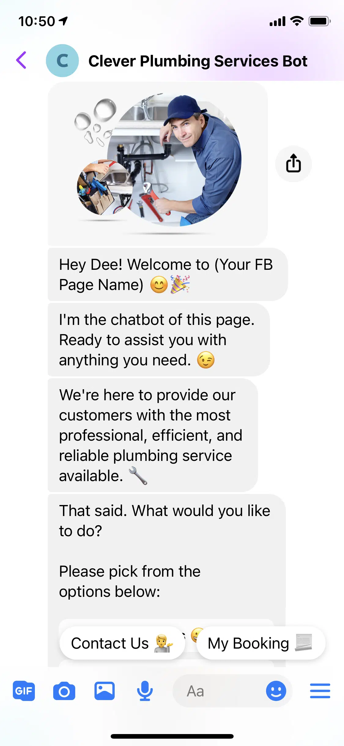 Use this FREE Plumbing Services Template to install a chatbot on your Facebook Page.