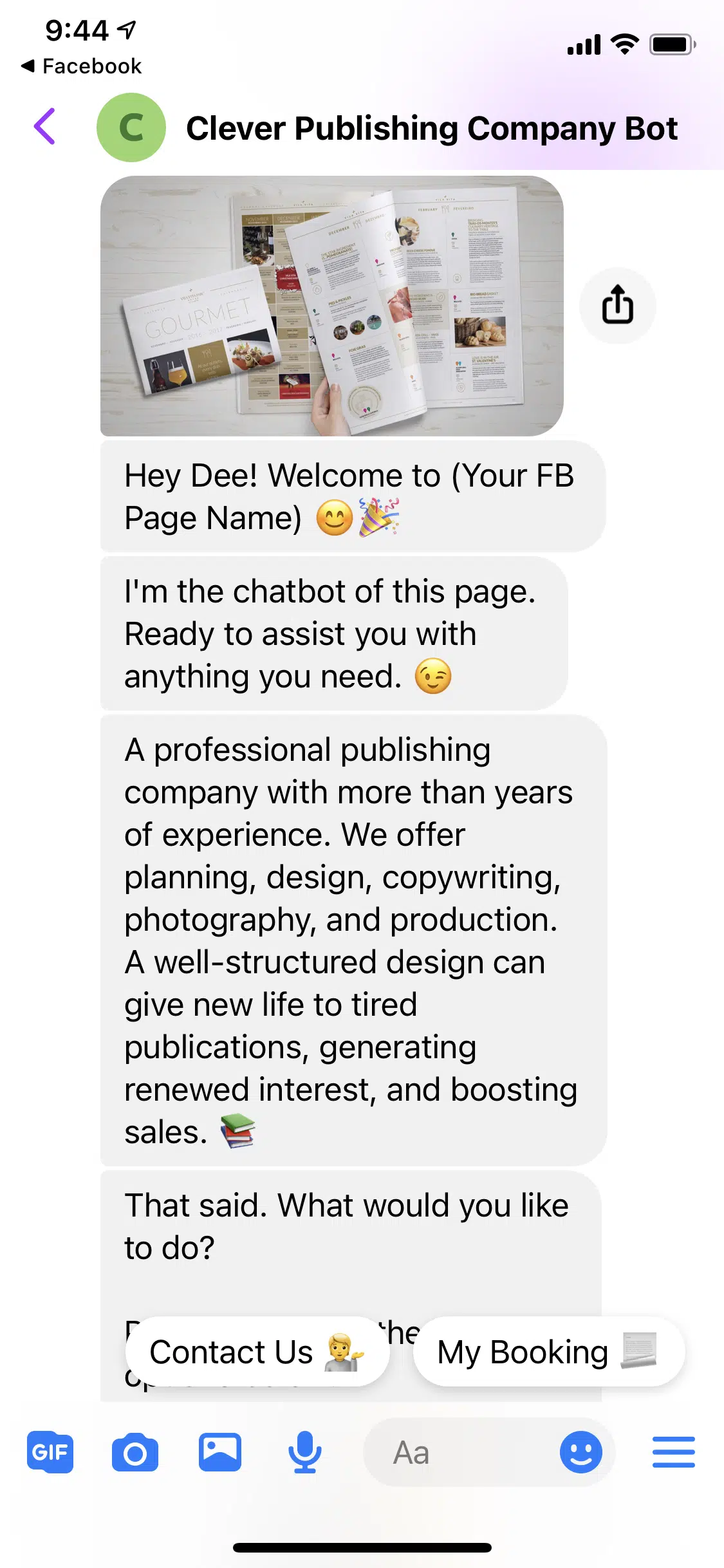 Use this FREE Publishing Company Template to install a chatbot on your Facebook Page.