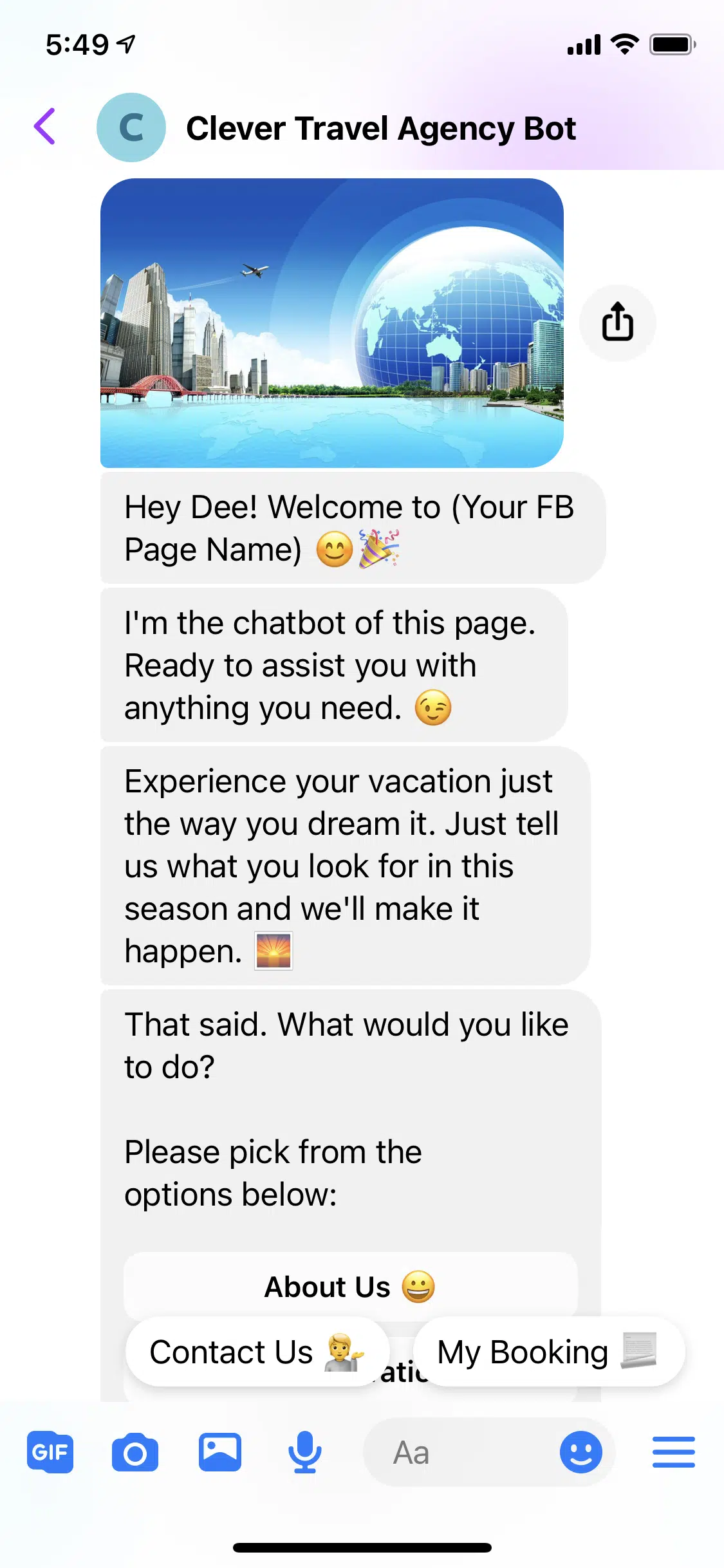 Use this FREE Travel Agency Template to install a chatbot on your Facebook Page.